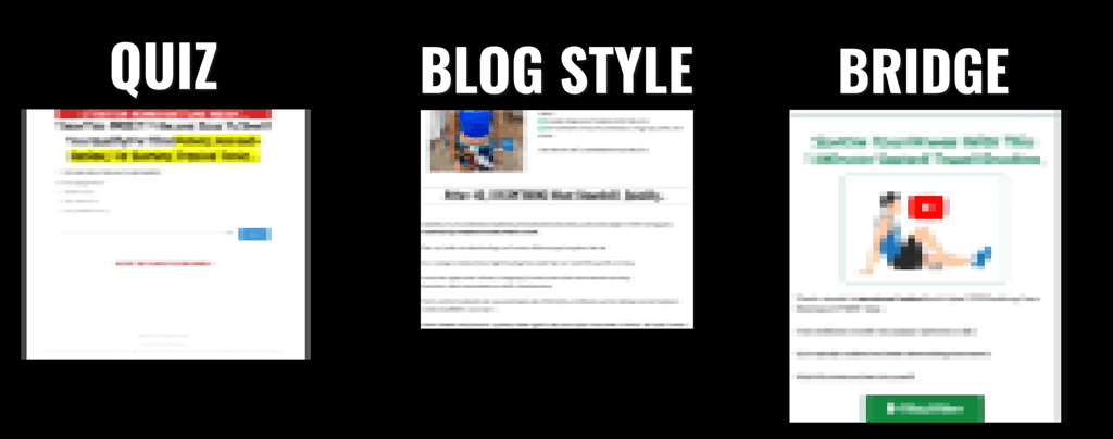Bridge page: super basic. Just a headline, maybe a short description, and a call to action. Gets the highest click-through rate for the offer but might need more clicks to make a sale.