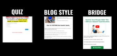 quiz landing page: It's where visitors take a quick quiz before seeing the offer. It might get fewer clicks to the affiliate link, but those who do reach the offer are more interested and likely to buy.